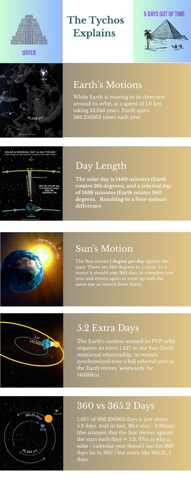 The Tychos model explains this elegantly – The Earth moves around its long 25,344-year PVP orbit in one direction, and the Sun moves in the other. Earth has two motions; While Earth is moving in its direction around its orbit, it is also rotating counterclockwise about its own axis, moving west. The Earth spins around its own axis 366.256363 times in one year and moves along its orbit at a speed of 1.6 km. On the other hand, the Sun also has two motions. It is moving in the opposite direction, also rotating but clockwise and moving east. As the Sun moves in its direction, it does so by 1 degree per day as measured against the stars. There are 360 degrees in a circle, so it seems it should take 360 days to complete one year and return to meet up with the same star as viewed from Earth. But a solar day is 4 minutes longer than the sidereal day. The solar day is 1440 minutes, and a sidereal day is 1436 minutes. Taking into account all of these motions – Earth’s spin counterclockwise and its movement west, and the Sun spins clockwise, and a 1-degree motion east – 5.2 extra days are created. These 5.2 are elegantly described by the relationship between the Earth’s two motions and the Sun’s motions.